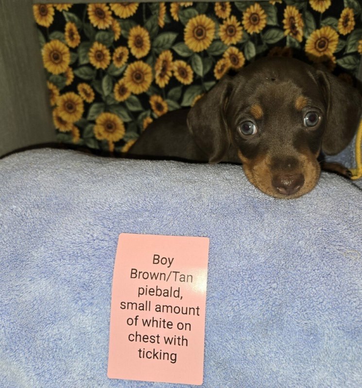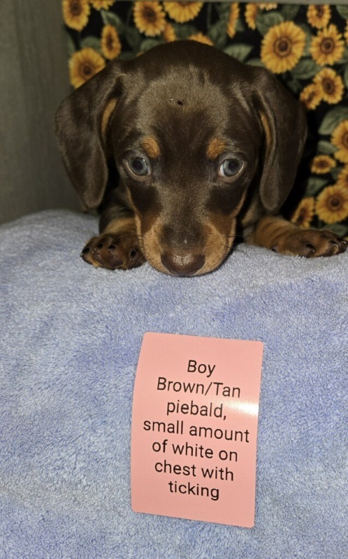 AKC Chocolate &Tan Piebald Male with small amount of white on chest with ticking