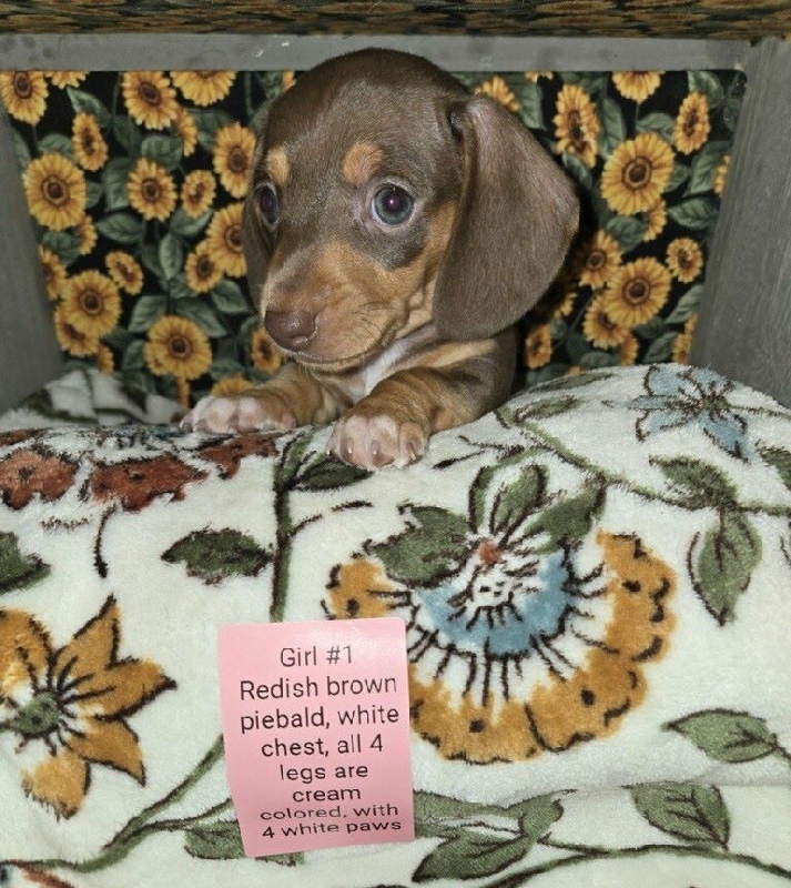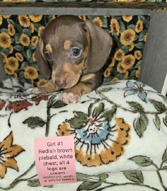 AKC Redish Chocolate &Tan Piebald Female with white chest, all 4 legs are cream colored, with 4 white paws