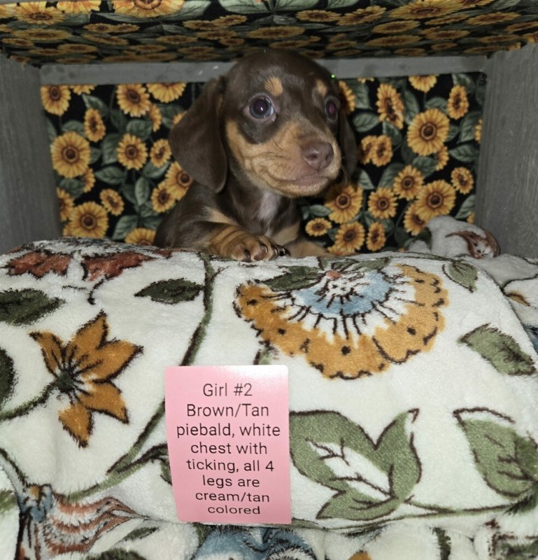 AKC Chocolate &Tan Piebald Female with white chest with ticking, all 4 legs are cream/tan colored